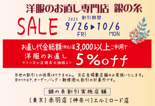 只今、銀の糸 赤羽店 エルミロード店にて「秋のお直しセール」開催中です。洋服のお直し代金総額3,000円以上ご利用でチラシ及び店頭表示価格より5%となります。