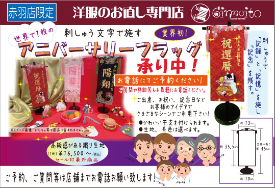 赤羽店では、割引対象外となりますが、刺繍文字で施す「アニバーサリーフラッグ作製」予約受付中です。七五三の記念撮影、長寿お祝いなど、お客様のアイデア次第で様々なシーンでご利用頂けます。贈り物としても喜ばれる逸品です。ご相談もお気軽にご連絡下さい。