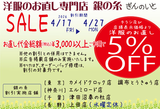 只今、銀の糸 カメイドクロック店 調布とうきゅう店 エルミロード店 津田沼奏の杜店 上田店にて「お客様感謝セール」開催中です。洋服のお直し代金総額3,000円以上ご利用でチラシ及び店頭表示価格より5%OFFとなります。ご来店を心よりお待ちしております。 下記の割引条件等詳細をご覧ください。 割引店舗:【東京】カメイドクロック店 調布とうきゅう店 【神奈川】エルミロード店 【千葉】津田沼奏の杜店 【長野】上田店 割引期間:2026年 4月17日~4月27日 2026年4月17日